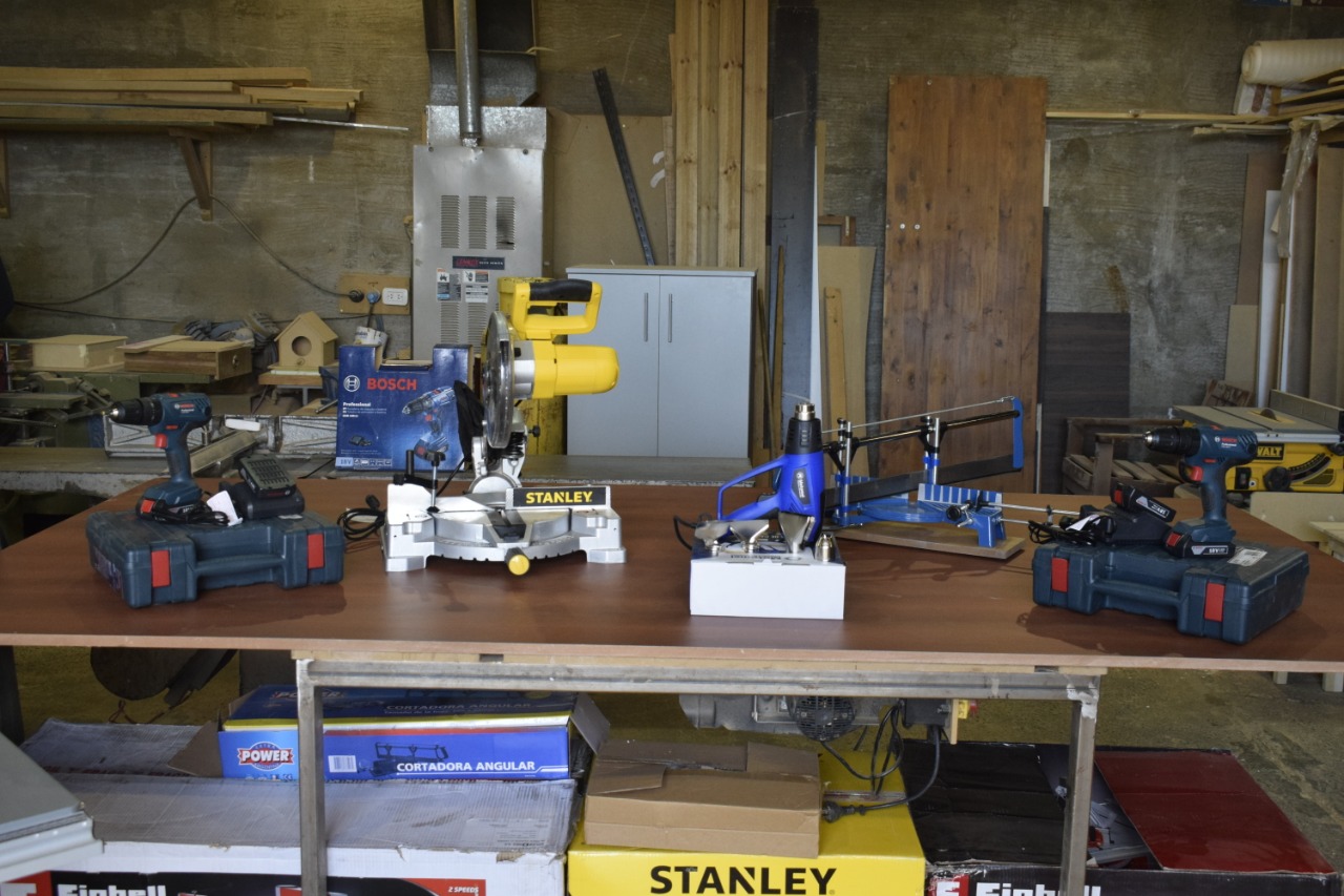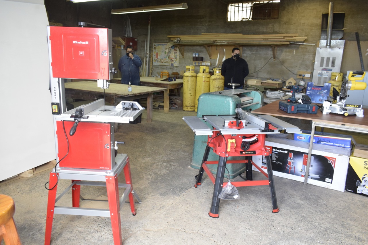 Respecto a la entrega, el taller de confección recibió dos máquinas de coser industriales, una cortadora de tela, una máquina de sublimación, estampadora y una impresora. En el taller de carpintería se les dio una sierra ingleteadora, dos taladros, una sierra sinfín, una sierra circular, una pistola de calor y una cortadora angular.