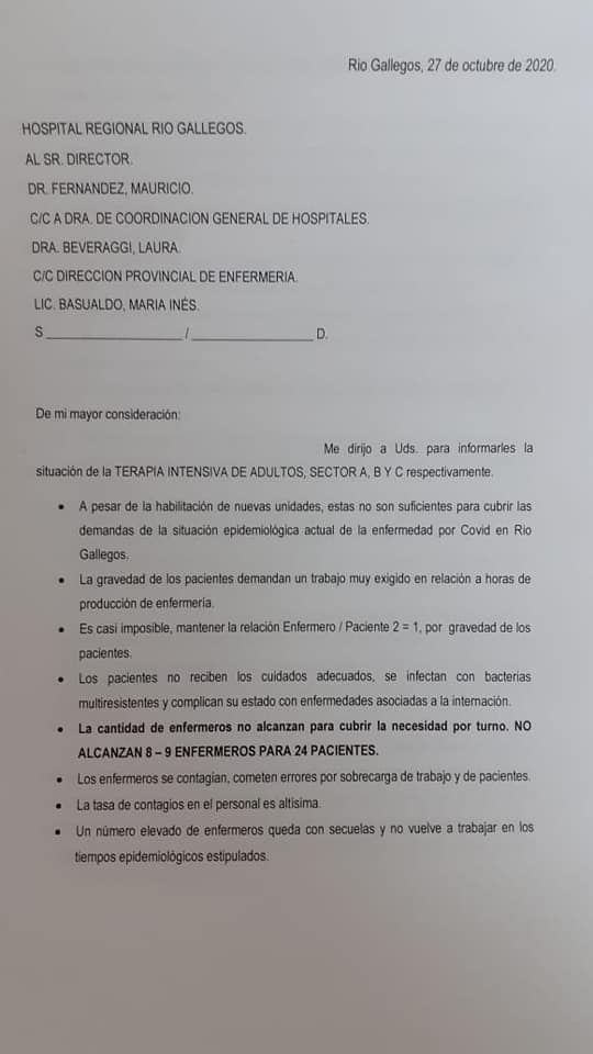 En los considerandos, la jefa de Terapia para Adultos detalló entre otros puntos que no hay unidades suficientes, la gravedad de los pacientes demanda mayor complejidad en la atención, los pacientes no reciben los cuidados adecuados, no alcanza el plantel para la cantidad de pacientes, los enfermeros se contagian (muchos quedan con secuelas por lo cual no pueden volver), no hay jefe de servicio en UTI (era Norma Villa, quien renunció la semana anterior, por las mismas causas). “No podemos atender. No de esta forma. No podemos atender a los pacientes, de la forma que merecen”, remarcó.