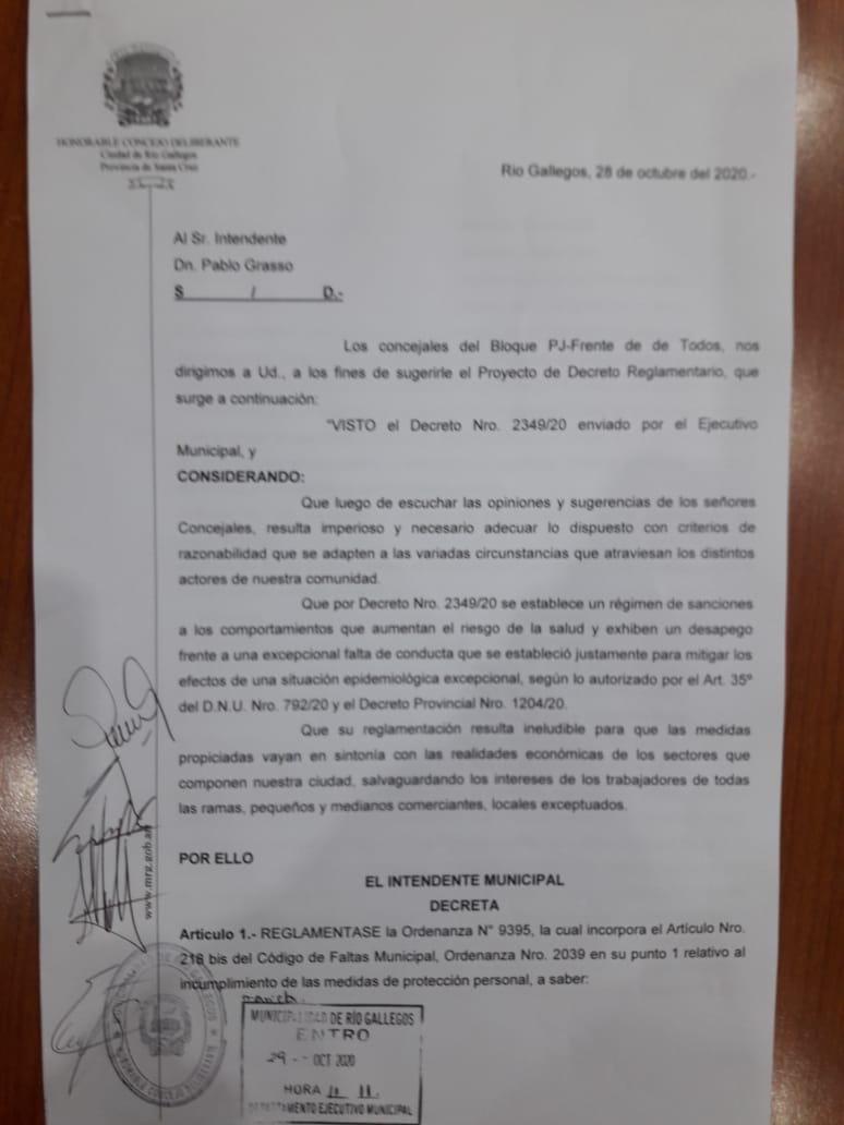 En este marco, el bloque oficialista presentó hoy al Intendente de Río Gallegos, Pablo Grasso, un proyecto de decreto reglamentario para la Ordenanza, donde sugiere modificaciones importantes a lo establecido.