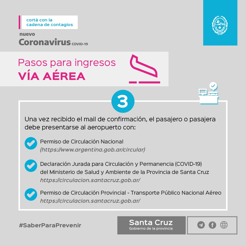 - Declaración Jurada de Circulación y Permanencia del Ministerio de Salud y Ambiente de la Provincia de Santa Cruz: https://circulacion.santacruz.gob.ar/