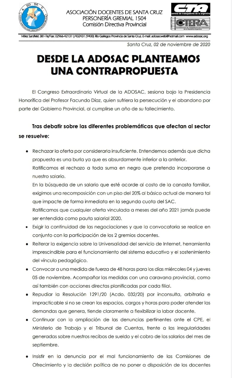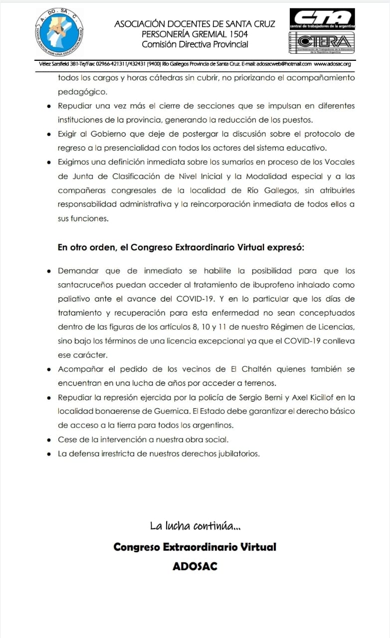 Entre otras cosas, exigieron continuar con las negociaciones y que la convocatoria se realice en conjunto con la participación de los 2 gremios docentes. Además, pidieron al Gobierno santacruceño que deje de postergar la discusión sobre el protocolo del regreso de la presencialidad con todos los actores involucrados y que dejen de flexibilizar la labor docente.