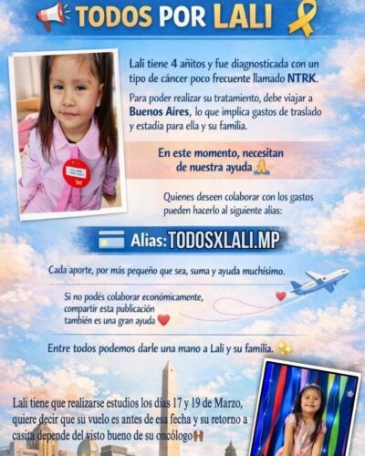 Piden ayuda para Lali, una niña de El Calafate que debe viajar a Buenos Aires por un cáncer poco frecuente La