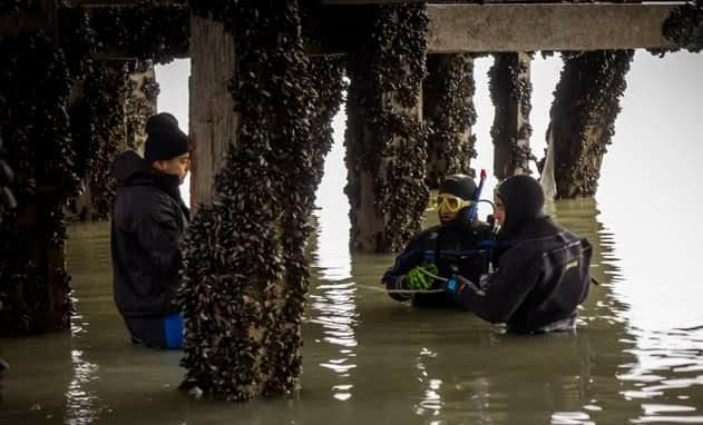 Paralelamente, en horas de la mañana, mientras la mareas se encontraba en su parte más baja, realizaron buceo entre los bancos de barro y maderas del muelle especiales del Grupo de Búsqueda y Rescate.