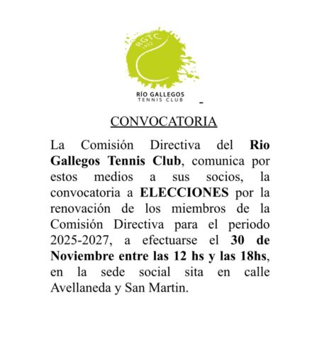 RÍO GALLEGOS TENNIS CLUB CONVOCA A ELECCIONES PARA RENOVAR SU COMISIÓN DIRECTIVA