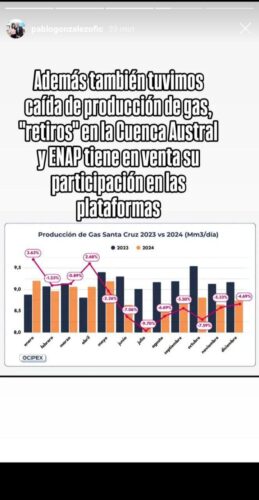 El gráfico compartido por González expone un panorama preocupante: la producción de petróleo en Santa Cruz cayó en casi todos los meses de 2024 en comparación con el año anterior, con picos de descenso del 16% en julio y un promedio que no logra recuperarse. En paralelo, la producción de gas también muestra caídas pronunciadas, superando el 7% en varios meses del año. Estas cifras no solo implican pérdidas para la industria, sino también para la economía provincial, que depende en gran parte de las regalías hidrocarburíferas.