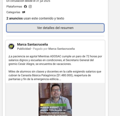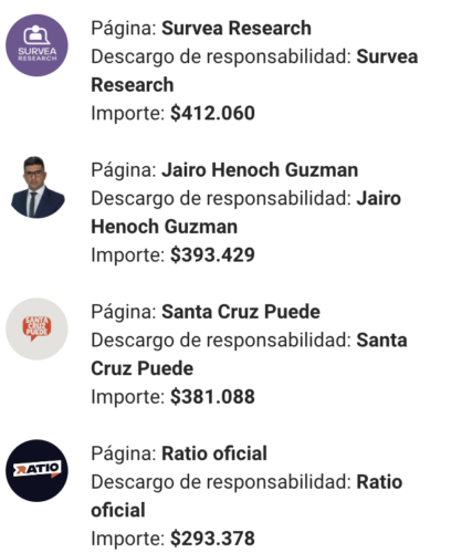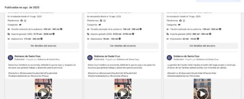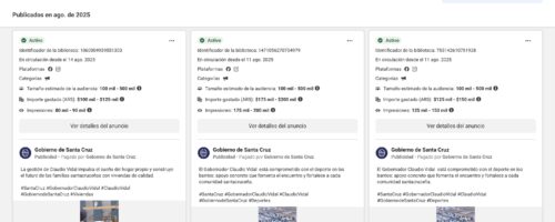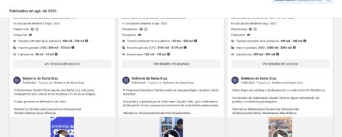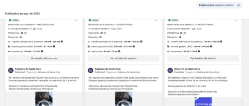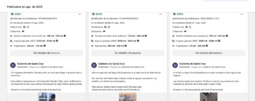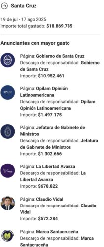 El análisis de la Biblioteca de Anuncios de Meta revela que entre mayo y agosto de 2025, el Gobierno de Santa Cruz, junto con páginas como Marca Santacruceña, Santa Cruz Puede y la fanpage del propio Claudio Vidal, gastaron $20.693.351 en anuncios de Facebook e Instagram.