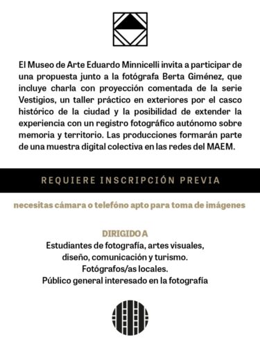 El Museo de Arte Eduardo Minnicelli (MAEM), dependiente del Consejo Provincial de Educación, convoca a la comunidad a participar de la Charla–Taller de Fotografía “Vestigios y territorios: miradas sobre la memoria”, a cargo de la reconocida artista Berta Isabel Giménez. La actividad se desarrollará en el marco de la muestra internacional BIENALSUR 2025 – Reconstruir Memoria.