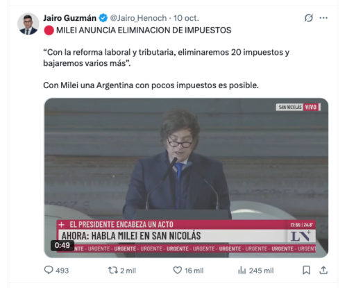 La cuenta de Guzmán tiene alrededor de 4.000 seguidores, una cifra modesta para cualquier dirigente que aspire a instalarse como referente nacional. Sin embargo, muchos de sus posteos alcanzan entre 6.000 y 60.000 visualizaciones, con picos que superan las 200.000 impresiones y más de 20.000 interacciones.