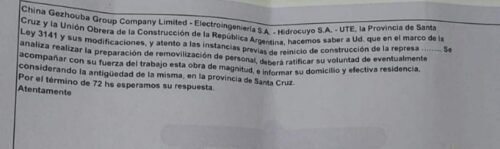 En las últimas horas comenzó a circular un documento con membrete de la UTE China Gezhouba – Electroingeniería S.A. – Hidrocuyo S.A., junto a la Provincia de Santa Cruz y la UOCRA.