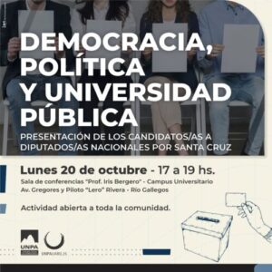A pocos días de las elecciones legislativas nacionales, la Unidad Académica Río Gallegos de la Universidad Nacional de la Patagonia Austral (UNPA-UARG) será escenario de un encuentro con los candidatos y candidatas al Congreso por Santa Cruz. La cita será este lunes 20 de octubre a las 17 horas en la sala de conferencias “Prof. Iris Bergero”, donde cada postulante dispondrá de un espacio para presentar sus propuestas y puntos de vista.