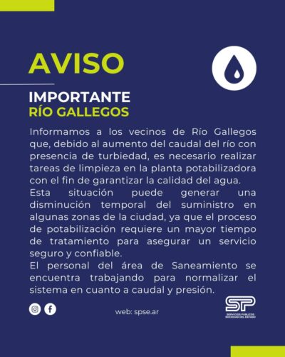 Vecinos de Río Gallegos volvieron a manifestar su malestar por problemas en el suministro de agua, luego de que Servicios Públicos Sociedad del Estado informara que realiza tareas de limpieza en la planta potabilizadora debido al aumento del caudal del río y la presencia de turbiedad.