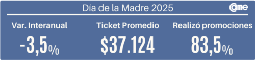 Las ventas por el Día de la Madre 2025 cayeron 3,5% interanual en los comercios minoristas pymes, según un relevamiento de la Confederación Argentina de la Mediana Empresa (CAME). Es el cuarto descenso consecutivopara esta fecha, en un contexto marcado por la pérdida del poder adquisitivo y un consumo que no logra recuperarse.