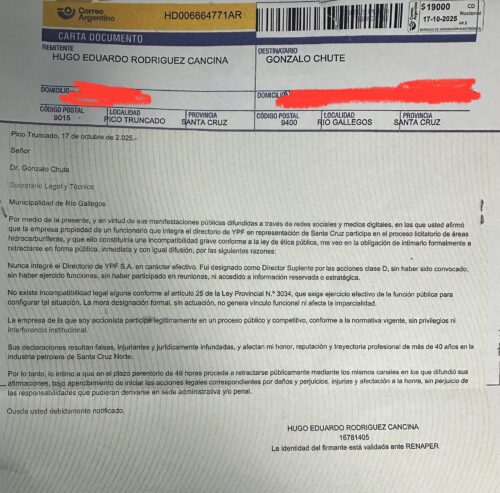 Un nuevo capítulo en la obsesión oficial por silenciar a quien incomoda. El empresario Hugo Rodríguez, dueño de Brest S.A. y Director Suplente de YPF por la Provincia de Santa Cruz, me envió una Carta Documento exigiéndome retractación. No sorprende: cuando el poder no puede comprar, intenta callar.
