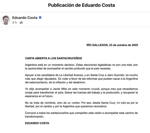 Pero lo central no está en el texto, sino en el contexto. Costa estuvo políticamente desaparecido en los últimos años. Su estructura se disolvió. La UCR santacruceña lo dejó en coma 4. Ni conducción partidaria, ni candidatura legislativa, ni control territorial. Era, hasta ayer, un ex.