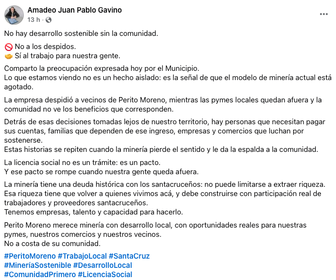 Finalmente, destacó que Perito Moreno y Santa Cruz “merecen una minería con desarrollo local, con oportunidades reales para nuestras pymes, nuestros comercios y nuestros vecinos, no a costa de su comunidad”