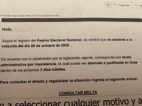 Días después de las elecciones legislativas del 26 de octubre, la Cámara Nacional Electoral (CNE) emitió una advertencia ante una nueva modalidad de estafa virtual que apunta a los votantes. Se trata de un caso de “phishing electoral”, en el que un correo falso intenta engañar a los ciudadanos con el argumento del pago de multas por no haber asistido a votar.