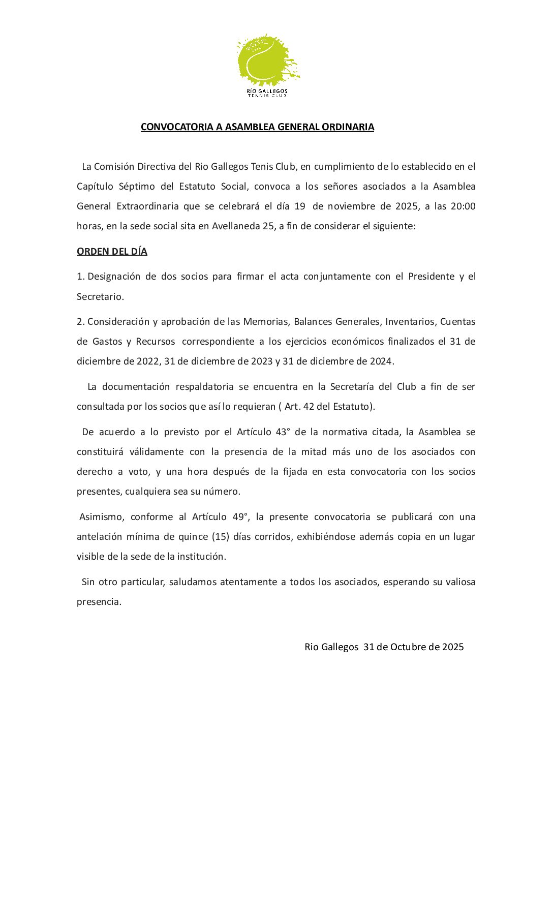 La Comisión Directiva del Río Gallegos Tenis Club informó que, conforme a lo establecido en su Estatuto Social, se convoca a los socios a participar de la Asamblea General Ordinaria que se llevará a cabo el miércoles 19 de noviembre de 2025 a las 20:00 horas, en la sede social ubicada en Avellaneda 25.