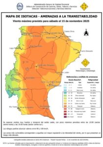 Según el mapa de isotacas elaborado por el área de Meteorología y Climatología, se prevén ráfagas de hasta 100 km/h que afectarían amplios sectores del territorio, especialmente las zonas más expuestas del centro y sur provincial.