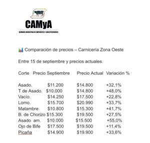 Leonardo Rafael, presidente de la Cámara Argentina de Matarifes y Abastecedores (Camya), estimó que desde septiembre la carne aumentó entre 20% y 25%, lo que equivale a unos $3.000 por corte en promedio. Su vicepresidente, Sergio Pedace, planteó un aumento algo menor: un 15% desde octubre en el ganado en pie, con traslado casi total a los valores de mostrador.