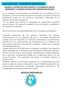 La Asociación Docentes de Santa Cruz (ADOSAC) definió este fin de semana su estrategia de cara a la próxima audiencia de conciliación obligatoria con el Gobierno Provincial. En un congreso extraordinario celebrado en Los Antiguos, el sindicato resolvió concurrir a la reunión de este jueves 27 sin paro, pero ratificando un pliego de exigencias que consideran “urgentes e impostergables”.