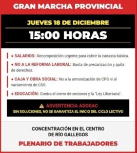 Este jueves 18 de diciembre se llevará adelante una movilización en la ciudad de Río Gallegos en rechazo a la reforma laboral impulsada por el gobierno nacional que encabeza el presidente Javier Milei. La convocatoria forma parte de una jornada de protesta a nivel nacional.