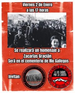 Este viernes 2 de enero, se realizará un acto homenaje en el Cementerio de Río Gallegos para recordar a Zacarías Gracián, considerado la primera víctima de la represión estatal durante las huelgas obreras patagónicas de 1921, un proceso que derivó en los fusilamientos masivos de trabajadores rurales en Santa Cruz.