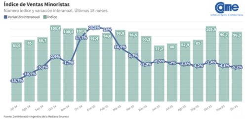 En diciembre, el comercio minorista pyme experimentó un retroceso del 5,2% interanual a precios constantes. En contrapartida, el número varió en la medición desestacionalizada frente a noviembre: el resultado fue de un incremento del 5,2%. Con estos valores, el índice de todo el 2025 cerró con una variación positiva acumulada del 2,5%.