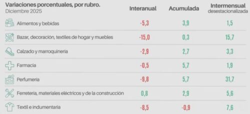El análisis sectorial confirma la tendencia recesiva reciente: seis de los siete rubros relevados finalizaron con números rojos. Las contracciones más agudas se verificaron en Bazar y decoración (-15%), Perfumería (-9,8%) y Textil e indumentaria (-8,5%). La única excepción a la regla fue el rubro Ferretería, materiales eléctricos y de la construcción, que logró sostenerse con una leve alza del 0,8%.