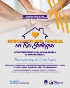 La Secretaría de Niñez, Adolescencia y Familia de Río Gallegos abrió una convocatoria para encontrar una familia solidaria transitoria que pueda acompañar el crecimiento y desarrollo de una niña de 2 años, un niño de 8 años y una niña de 5 años, garantizando sus derechos y bienestar en una etapa clave de su vida.