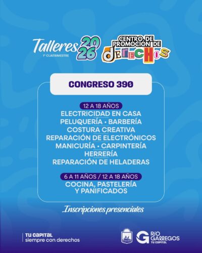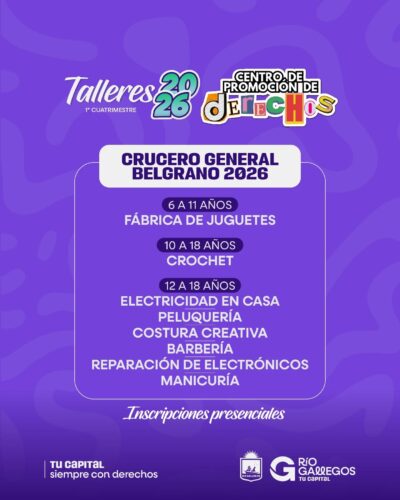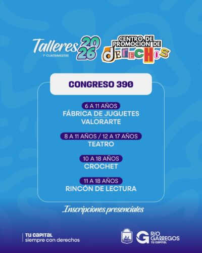 La Municipalidad de Río Gallegos habilitará desde este lunes, a partir de las 12 del mediodía, la inscripción a los talleres cuatrimestrales 2026 del Centro de Promoción de Derechos, un espacio que funciona bajo la órbita de la Secretaría de Niñez, Adolescencia y Familia.