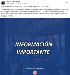 La empresa CityBus, concesionaria del servicio en la capital santacruceña, informó que desde el 1° de marzo rige el nuevo valor del boleto.