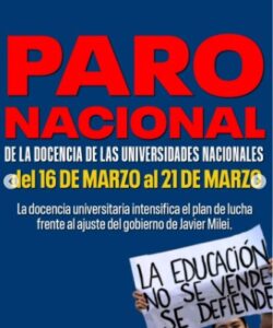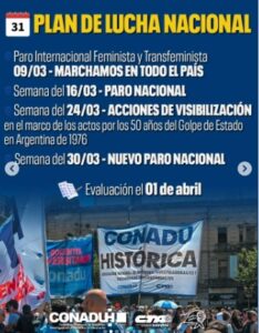 Además, el plan de lucha contempla acciones de visibilización durante la semana del 24 de marzo, en el marco de los 50 años del Golpe de Estado en Argentina de 1976, así como una nueva medida de fuerza durante la semana del 30 de marzo.