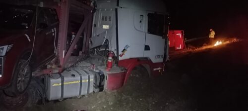 Al llegar al lugar, los efectivos encontraron dos camiones sobre la banquina: uno en “posición de tijera” y el otro volcado sobre uno de sus laterales. En la escena, varias personas asistían a uno de los conductores, que se encontraba tendido en el suelo.
