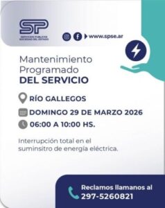 La empresa transportadora de energía, junto a Servicios Públicos Sociedad del Estado (SPSE), informó que este domingo 29 de marzo se realizará un corte total del suministro eléctrico en Río Gallegos. La interrupción está programada entre las 06:00 y las 10:00 horas, y afectará a toda la ciudad.