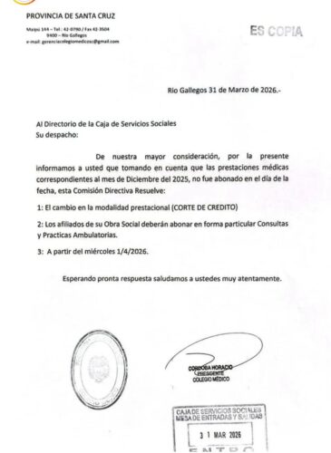 Lo que hasta ahora se comentaba por lo bajo, terminó de confirmarse en un documento oficial. El Colegio Médico resolvió cortar el crédito a la Caja de Servicios Sociales por falta de pago de prestaciones correspondientes a diciembre de 2025, y la decisión ya tiene impacto concreto: desde el 1 de abril, los afiliados deberán pagar de su bolsillo consultas y prácticas ambulatorias.