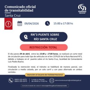 La Vialidad Nacional informó que se realizarán cortes totales de circulación sobre la Ruta Nacional 3 a la altura del puente sobre el río Santa Cruz, en cercanías de Comandante Luis Piedra Buena.