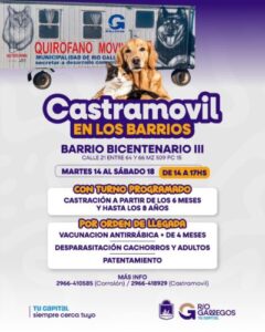 El quirófano móvil municipal retomará su recorrido en Río Gallegos y se instalará desde este martes 14 hasta el sábado 18 de abril en el Barrio Bicentenario III, en el marco de una campaña que busca reforzar la salud animal y controlar la superpoblación.