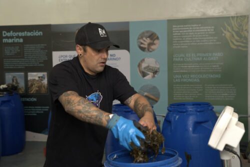 Milagros es la encargada de recibir las láminas reproductivas del alga, enjuagarlas, generar las condiciones ideales de humedad, luz y PH para desencadenar la reproducción, y cuidar de eso que, en criollo, llama “algas bebés” hasta que tengan el tamaño suficiente como para ir al agua. Desde que Jonathan cosecha láminas reproductivas hasta que las “crías” de esas algas van al mar pueden pasar unos cuarenta días de extremos cuidados científicos y, a la vez, artesanales.