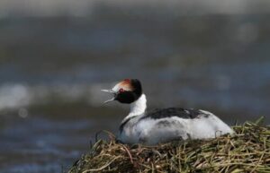 El macá tobiano (Podiceps gallardoi) es un ave zambullidora de tamaño pequeño, con un llamativo plumaje blanco y negro y un característico copete rojizo. Vive en lagunas de altura en la meseta santacruceña y es considerada endémica, es decir, no existe en ningún otro lugar del planeta.