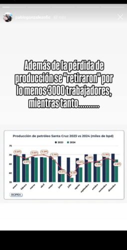 El gráfico compartido por González expone un panorama preocupante: la producción de petróleo en Santa Cruz cayó en casi todos los meses de 2024 en comparación con el año anterior, con picos de descenso del 16% en julio y un promedio que no logra recuperarse. En paralelo, la producción de gas también muestra caídas pronunciadas, superando el 7% en varios meses del año. Estas cifras no solo implican pérdidas para la industria, sino también para la economía provincial, que depende en gran parte de las regalías hidrocarburíferas.