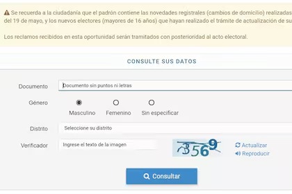 Los ciudadanos habilitados para votar pueden consultar el lugar y la mesa que les corresponde ingresando a la web oficial de la Cámara Nacional Electoral, en el siguiente enlace https://www.padron.gov.ar/ y para hacerlo, deben completar su número de documento, género, distrito electoral y un código verificador, y luego presionar el botón Consultar.